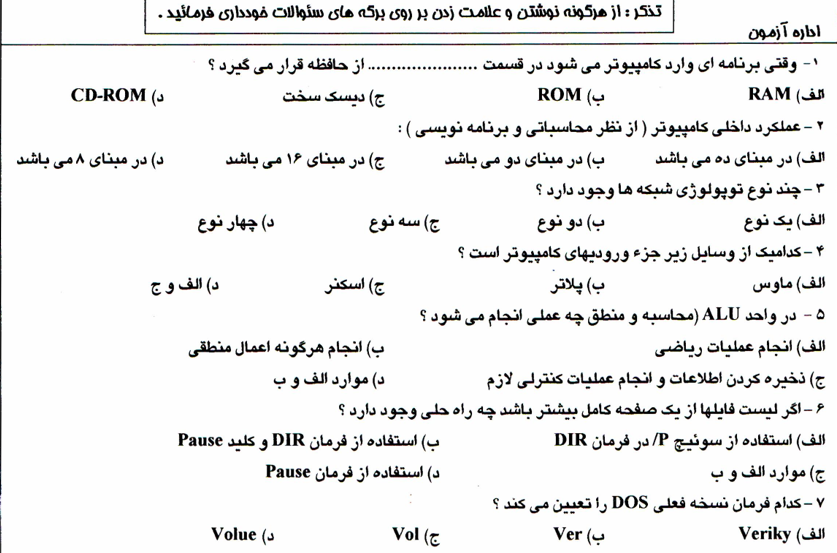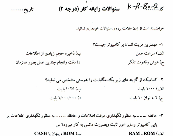 صفحه محصول - سوالات آزمون پایان دوره رایانه کار درجه 2 - 13 صفحه - pdf