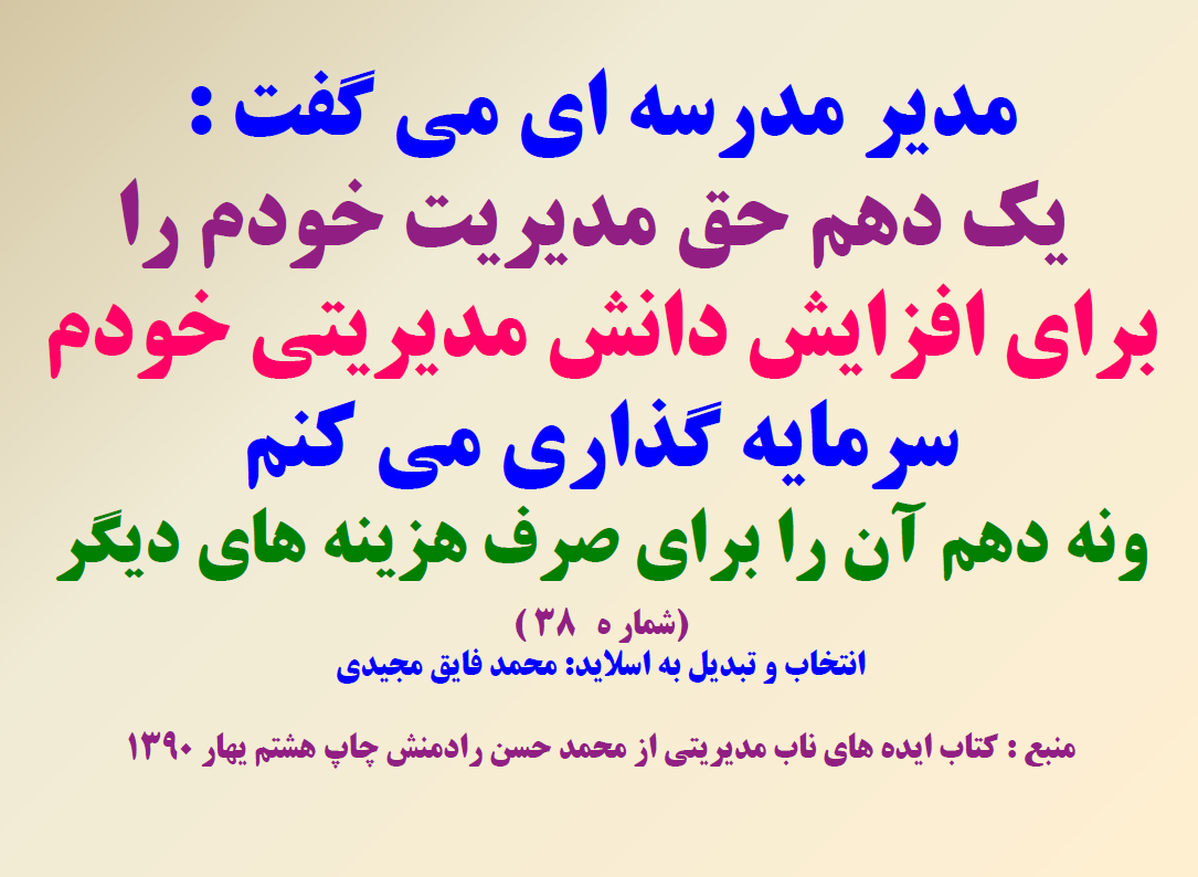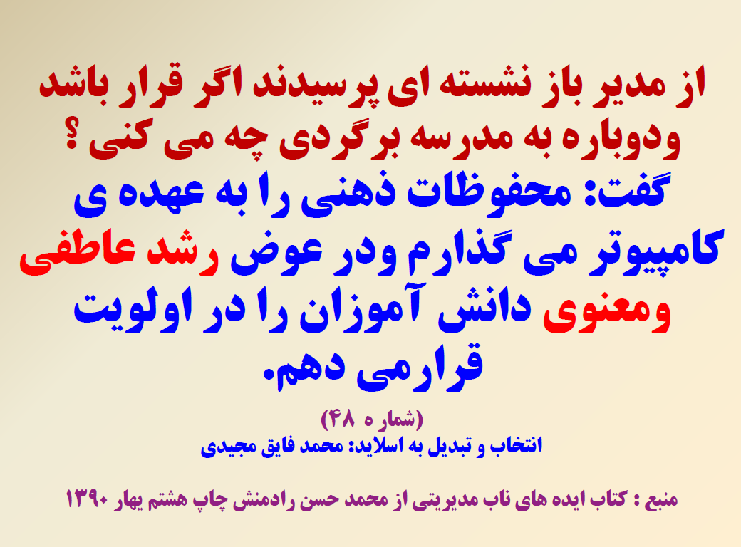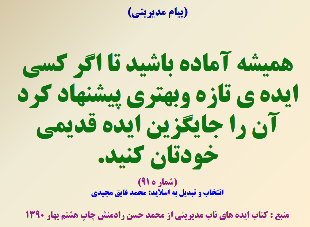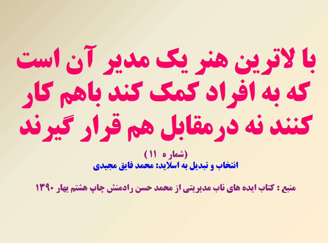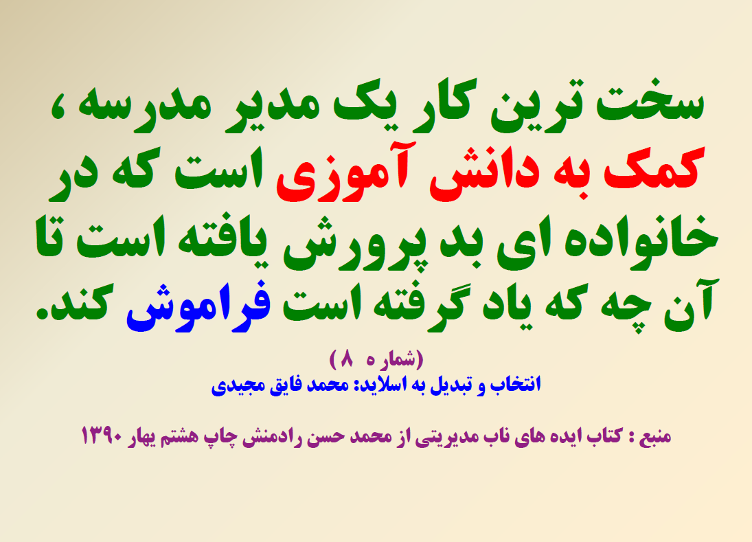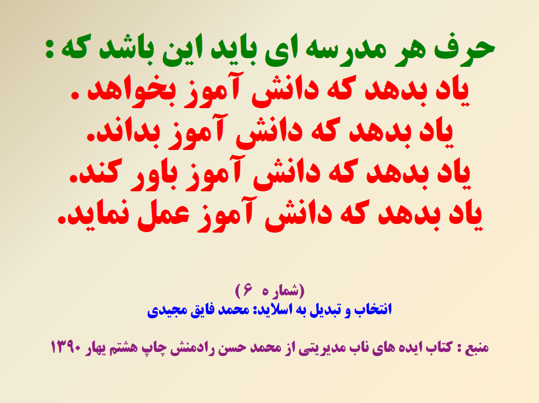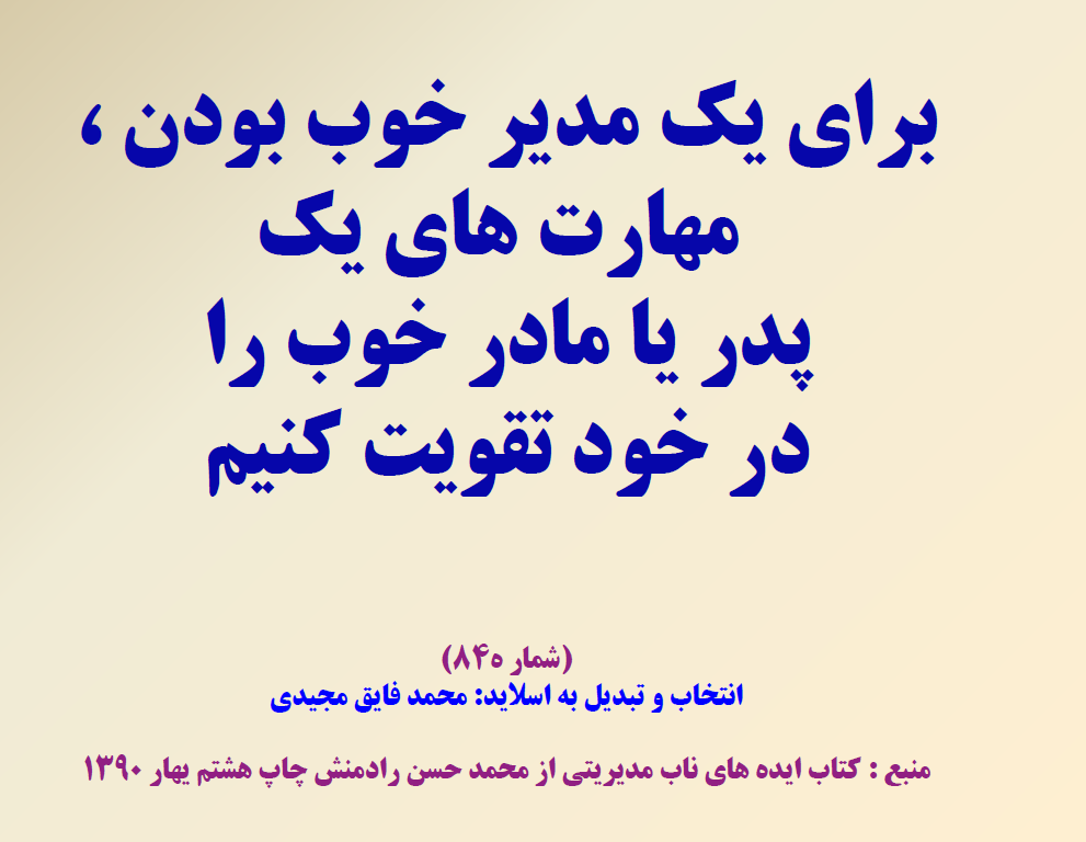 هر روز می توانید یک نکته کلیدی را یادداشت کنید وآن را به کار بگیری هر کدام ار اسلاید ها می تواند به مدیرکمک کند در یک جلسه حول محور همان اسلید بحث وتبادل تجربه کنند