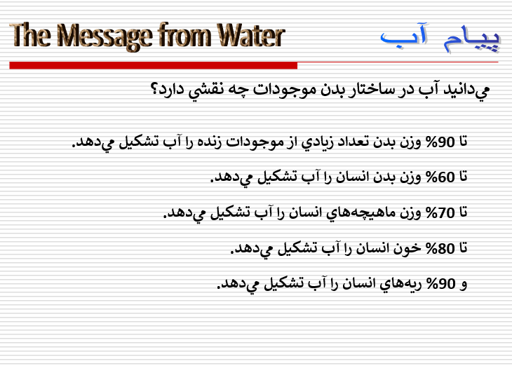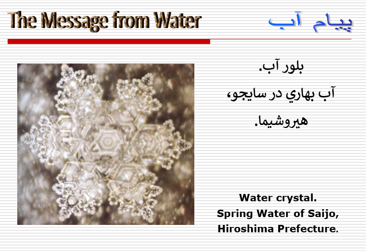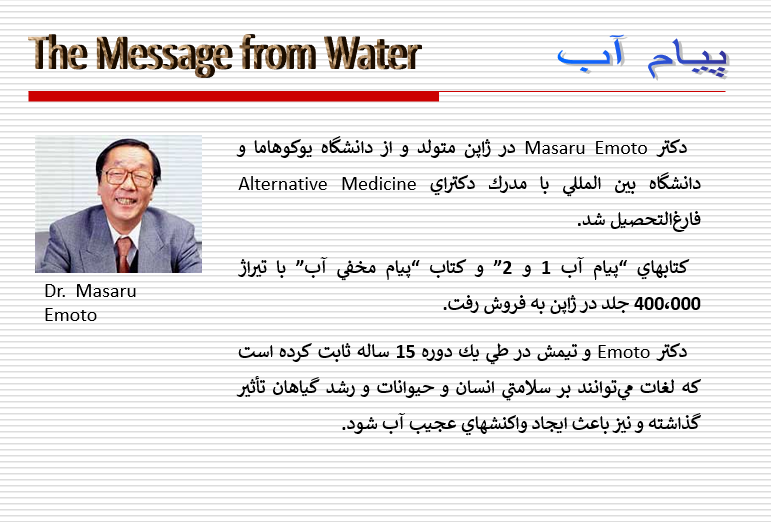 دکتر Emoto و تیمش در طی یک دوره 15 ساله ثابت کرده است که لغات می توانند بر سلامتی انسان و حیوانات و رشد گیاهان تاثیر گذاشته و نیز باعث ایجاد واکنشهای عجیب آب شود.....