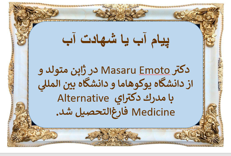 دکتر Masaru Emoto در ژاپن متولد و از دانشگاه یوکوهاما و دانشگاه بین المللی با مدرک دکترای Alternative Medicine فارغ التحصیل شد.