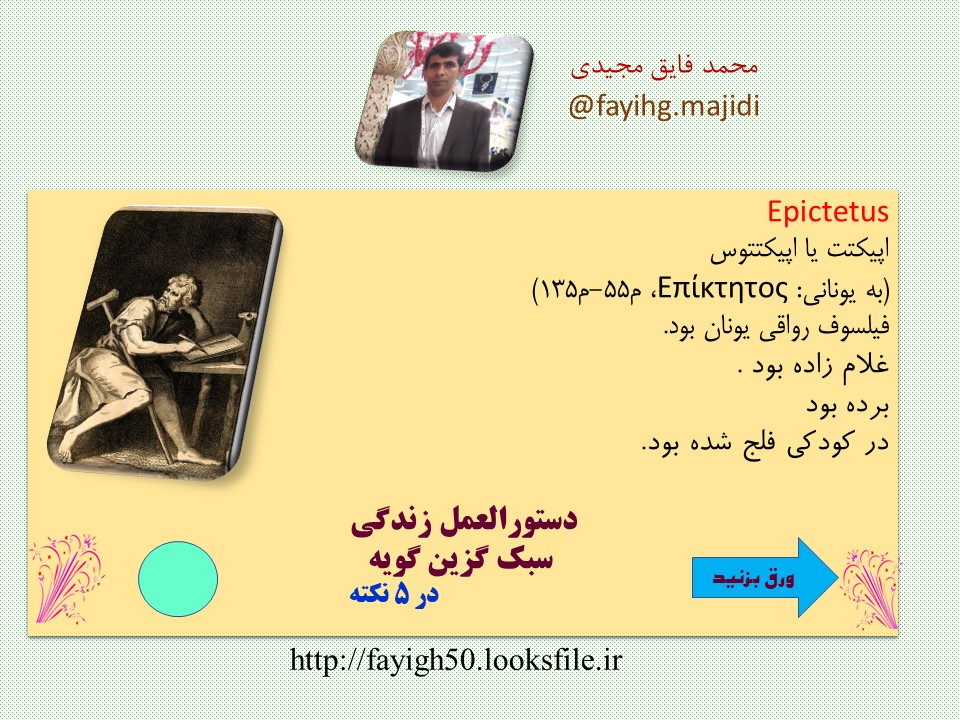 Epictetus پاور پوینت اپیکتت یا اپیکتتوس به یونانی Επίκτητος، م55-م135 فیلسوف رواقی یونان بود.غلام زاده بود .برده بوددر کودکی فلج شده بود. در پنج نکته